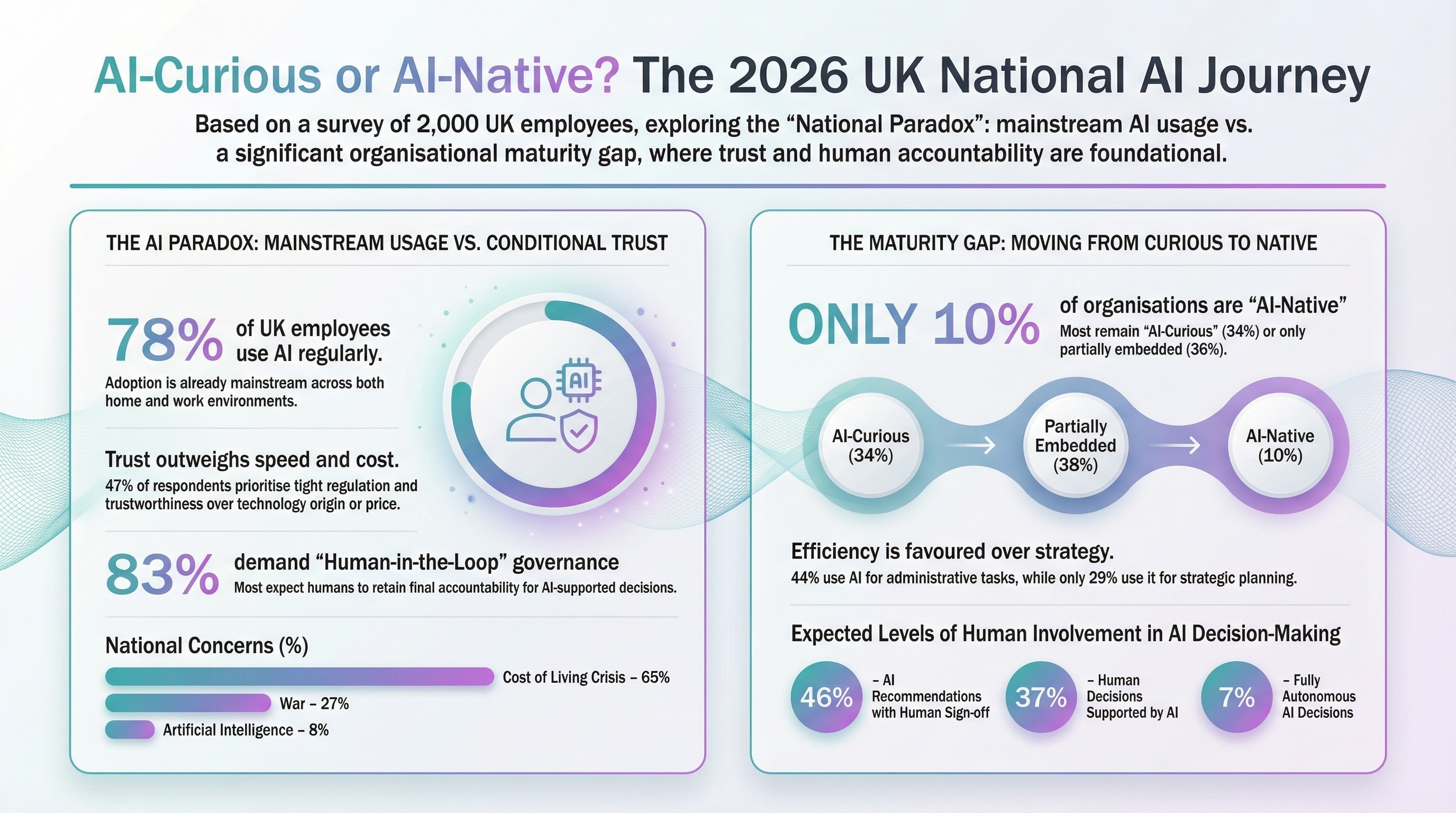 The findings point to a workforce that is pragmatic rather than resistant: open to AI, but clear that risk, accountability, and ownership cannot be delegated to systems.