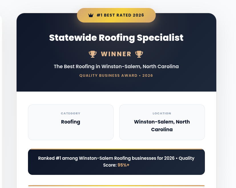 Quality Business Awards recognize top-performing businesses based on customer satisfaction, service quality, and overall reputation. Winners are selected through a comprehensive evaluation process to identify businesses that demonstrate consistent excellence. Statewide Roofing Specialist was recognized as one of the top roofing companies in Winston-Salem, North Carolina, for 2026.